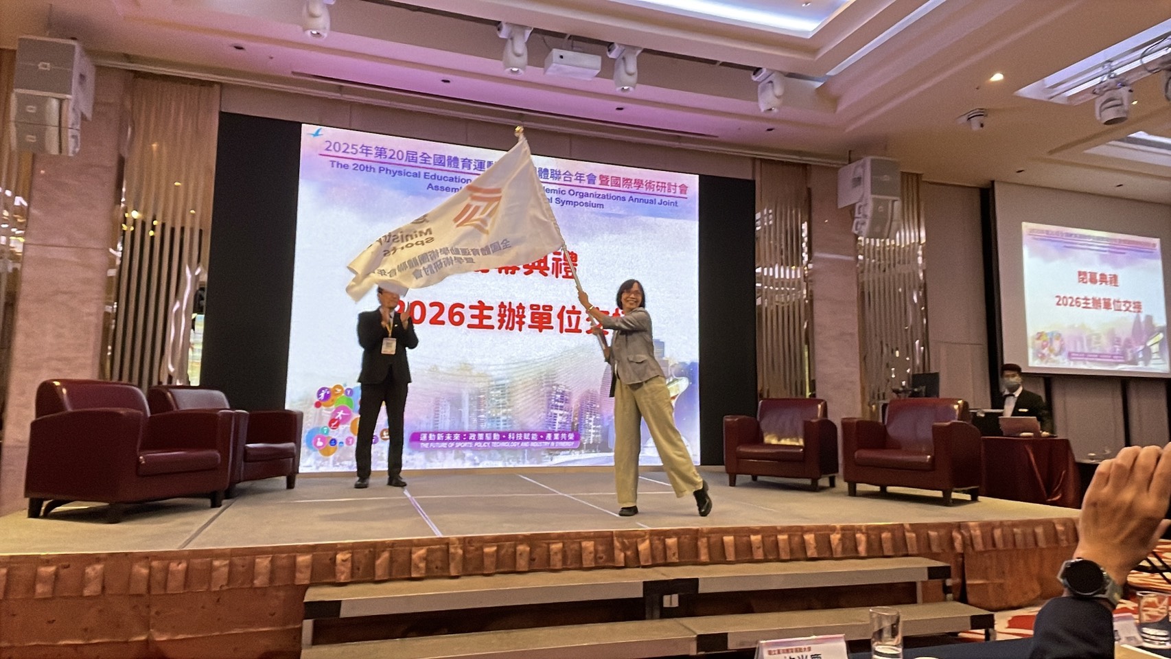 李素馨理事長於第 20 屆閉幕典禮揮舞大旗,正式接下第21屆全國體育運動學術團體聯合年會承辦權